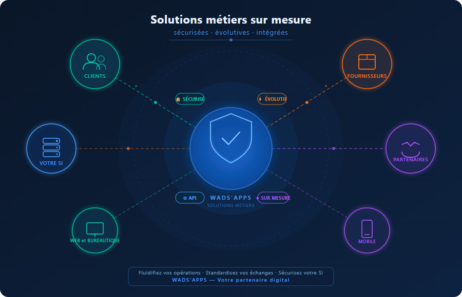 WADS’APPS ne développe pas des applications, mais de véritables solutions métiers : des outils bureautiques, web et mobiles qui fluidifient vos opérations, standardisent vos échanges et s’intègrent dans votre SI.